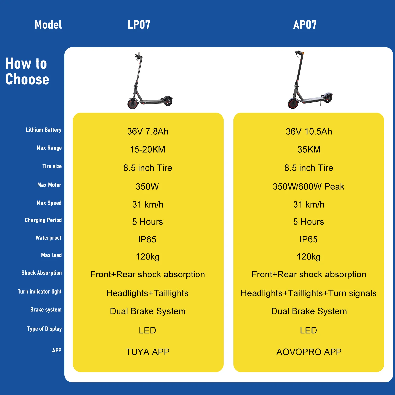AP07 Smart APP scooter paired with a 350W motor, up to 600w peak power, is designed to achieve excellent performance and ensure a comfortable and safe driving experience. 36V10.5AH high-capacity battery, with a maximum range of 25-35km (depending on weight, speed mode, and road conditions)